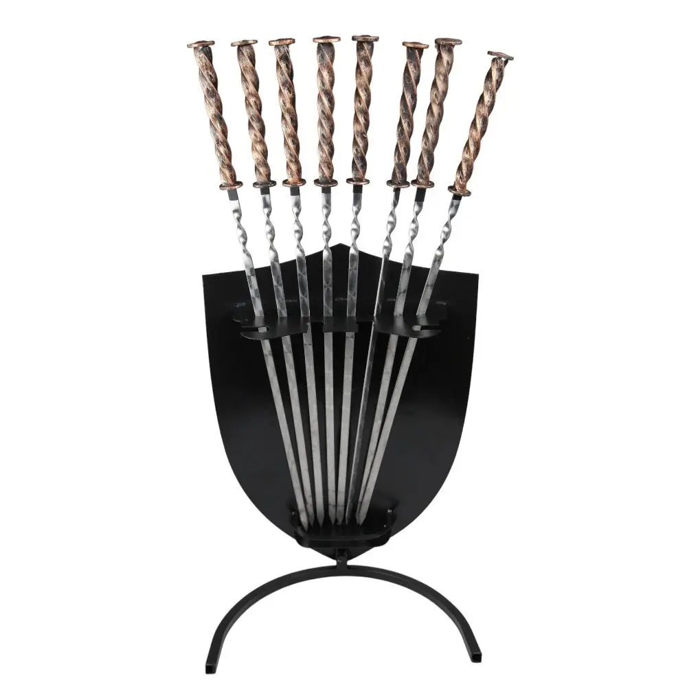 Прекрасно дополнят такую подставку шампуры и каминные аксессуары с коваными ручками. Подставка вмещает восемь шампуров и четыре вида каминных приборов. Необычная стойка в комплекте с приборами украсит ваше каминное пространство или мангальную зону! Такой каминный набор станет вашим незаменимым помощником по уходу за камином, жаровней мангала или топкой печи.
