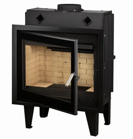 Каминная топка увеличенного объема вмещает поленья длиной до 55 см, которые сгорают до состояния пепла благодаря встроенной системе двойного дожига. Эта функция не только помогает экономить топливо, но и существенно повышает КПД прибора, доводя его до 75%.