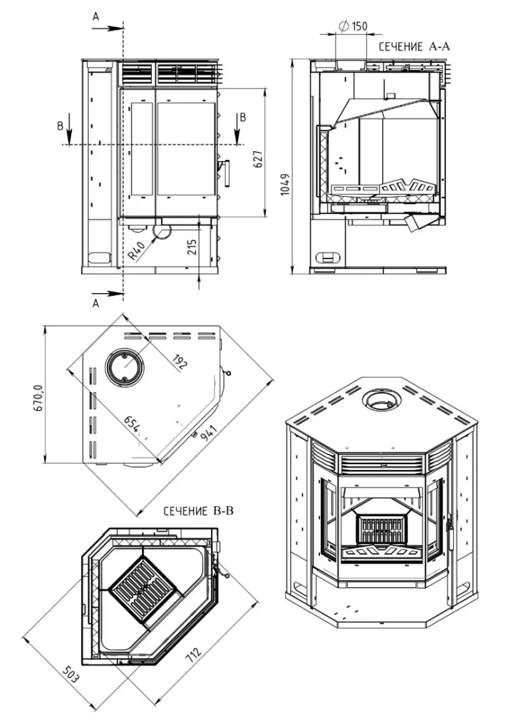 Печь-камин устанавливается в угол.