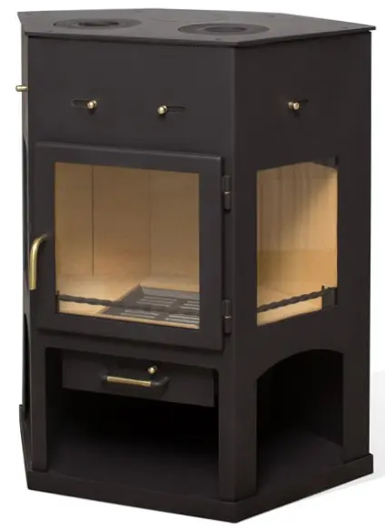 Объемная печь-камин “Енисей” с плитой от белорусского бренда “Мета-Бел” отлично подойдет для того, чтобы обогреть помещение площадью 55-110 кв. м. А расположенная в верхней части варочная панель с двумя чугунными конфорками позволит разогреть или приготовить пищу. При необходимости печь заменит мини-кухню или послужит резервным вариантом на случай отключения электричества или газа.